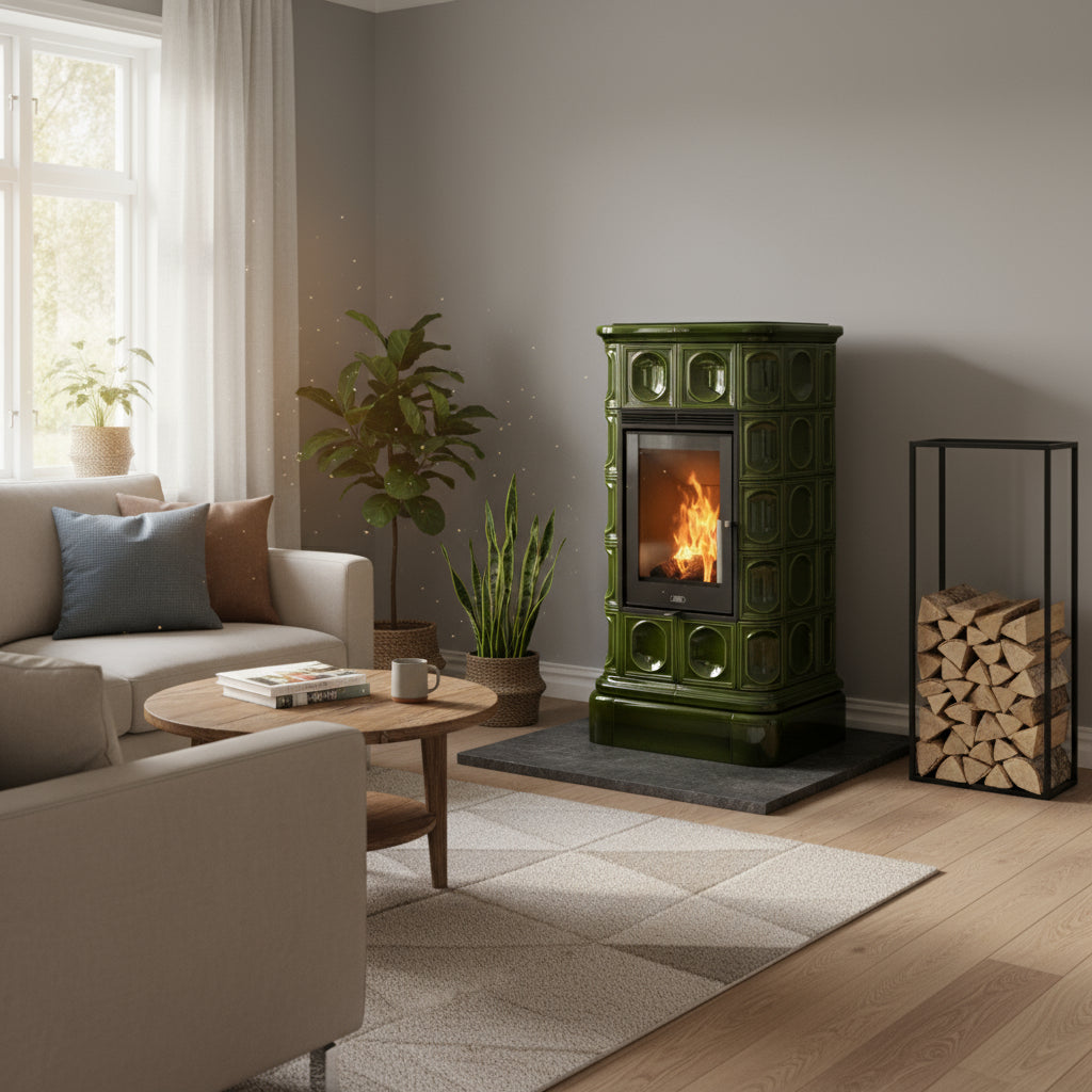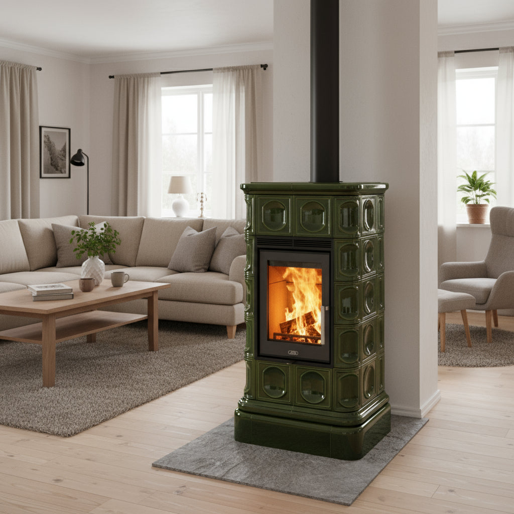 Grön Kakelkamin Kaledonie Exklusive skapar en varm och inbjudande atmosfär i ditt hem, där tidlös elegans möter modern prestanda. Perfekt för dig som värdesätter kvalitet, stil och genuint hantverk.