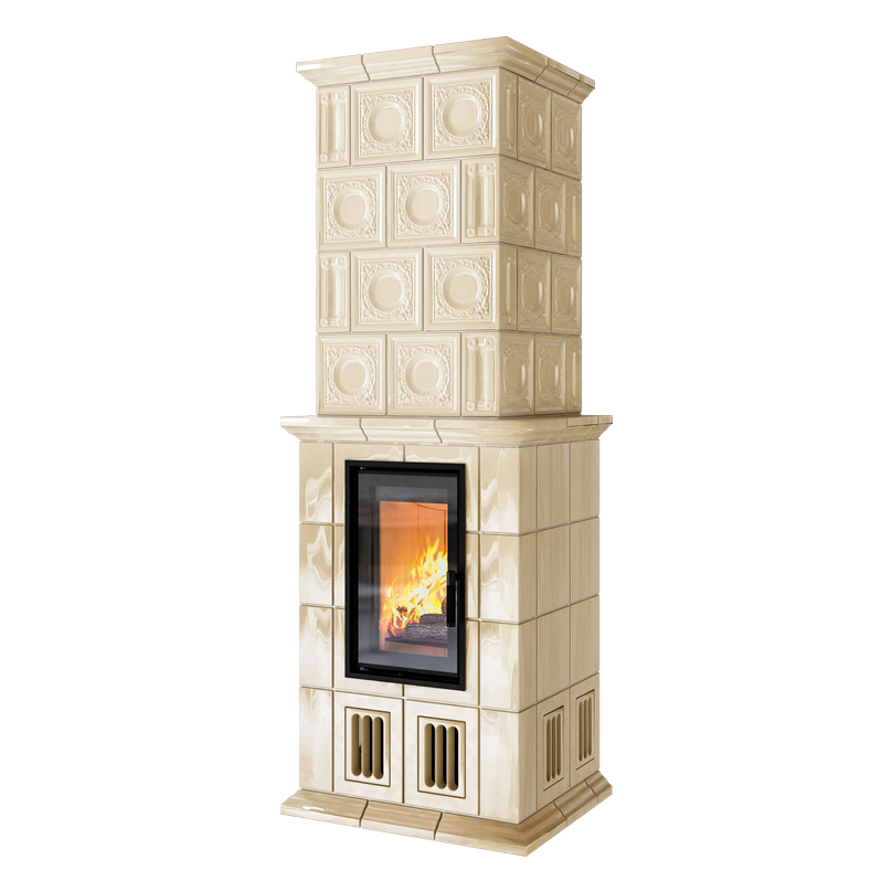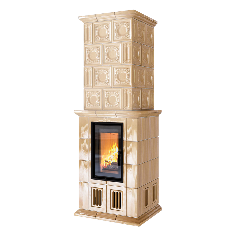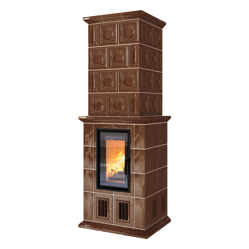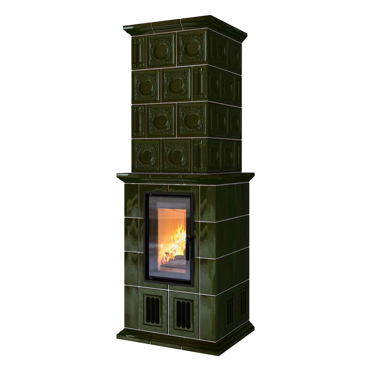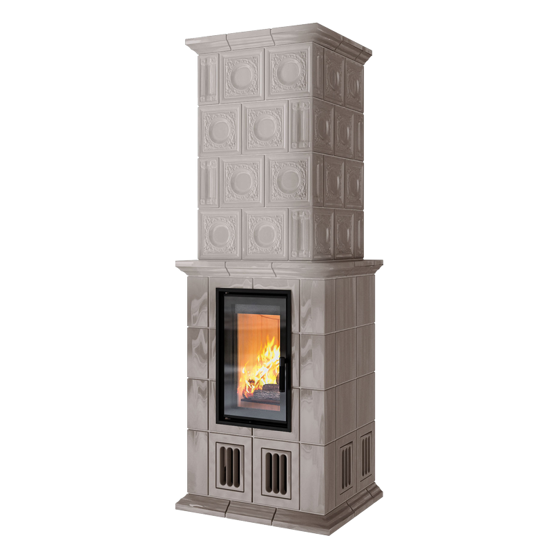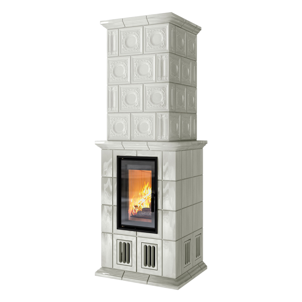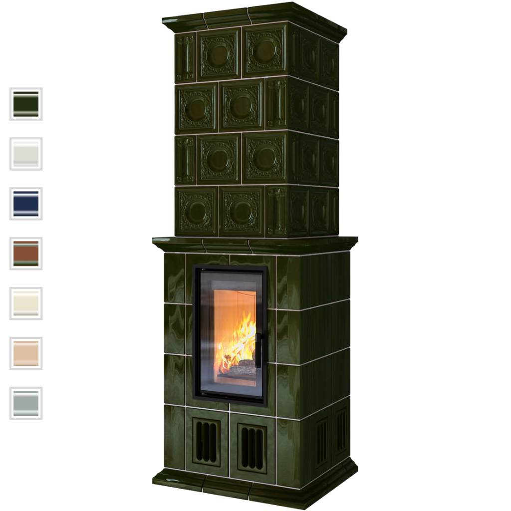 De vackra, värmelagrande kakelplattorna i Manchester- och Barockstil ger kaminen ett exklusivt uttryck. Formen är inspirerad av traditionella kakelugnar men med en modern, slank design som passar både i klassiska och nybyggda hem.