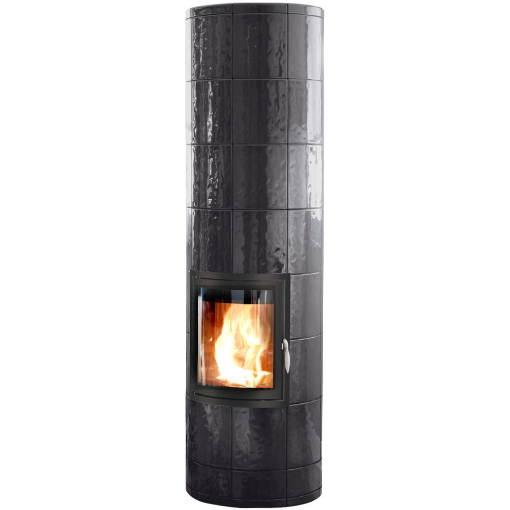 Den runda formen och den svarta-glänsande kakelklädseln ger kaminen ett modernt och tidlöst utseende. Kakelytan fungerar som en effektiv värmelagringsyta, vilket gör att värmen avges långsamt och jämnt även efter att elden har slocknat.