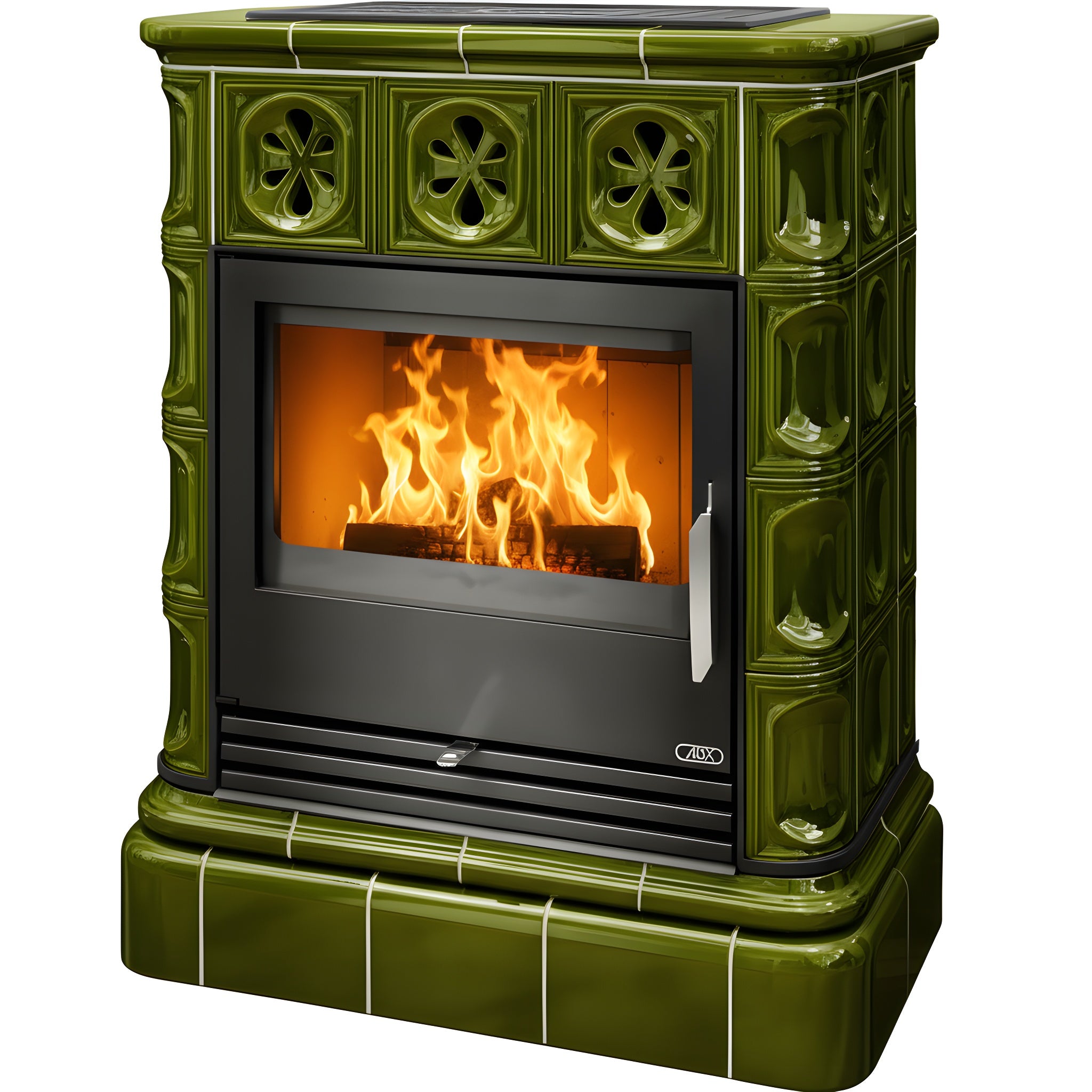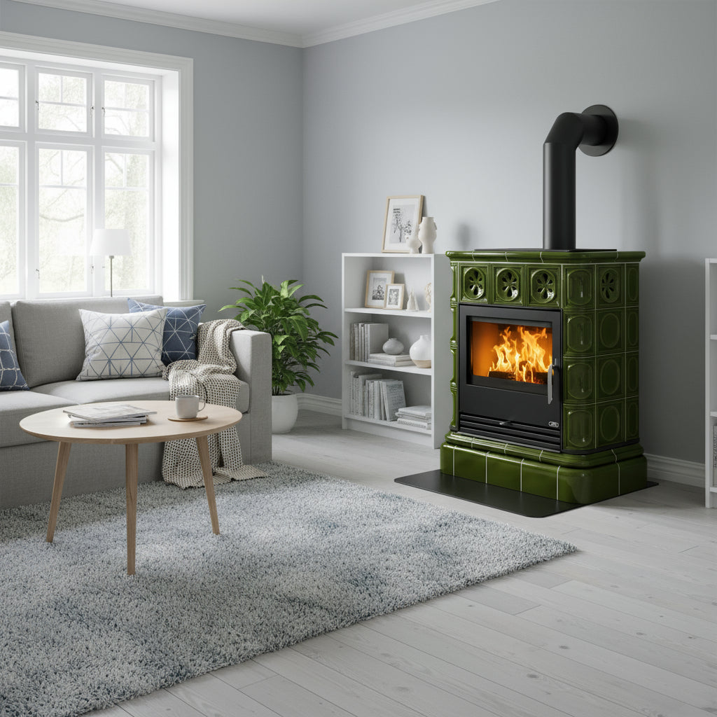 Tack vare den vackra kakelklädseln – som finns i både grönt och brunt – lagras värmen effektivt och ger en behaglig eftervärme efter att elden slocknat.