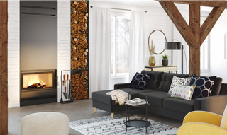 Kaminen är utrustad med en stor glasfront, självrengörande glassystem och dubbelförbränning för lägre utsläpp och längre brinntid. Invändigt är den klädd med vit eller svart chamotte som både skyddar och lagrar värme. Den tar vedlängder upp till 80 cm och erbjuder flexibel anslutning till extern luft.