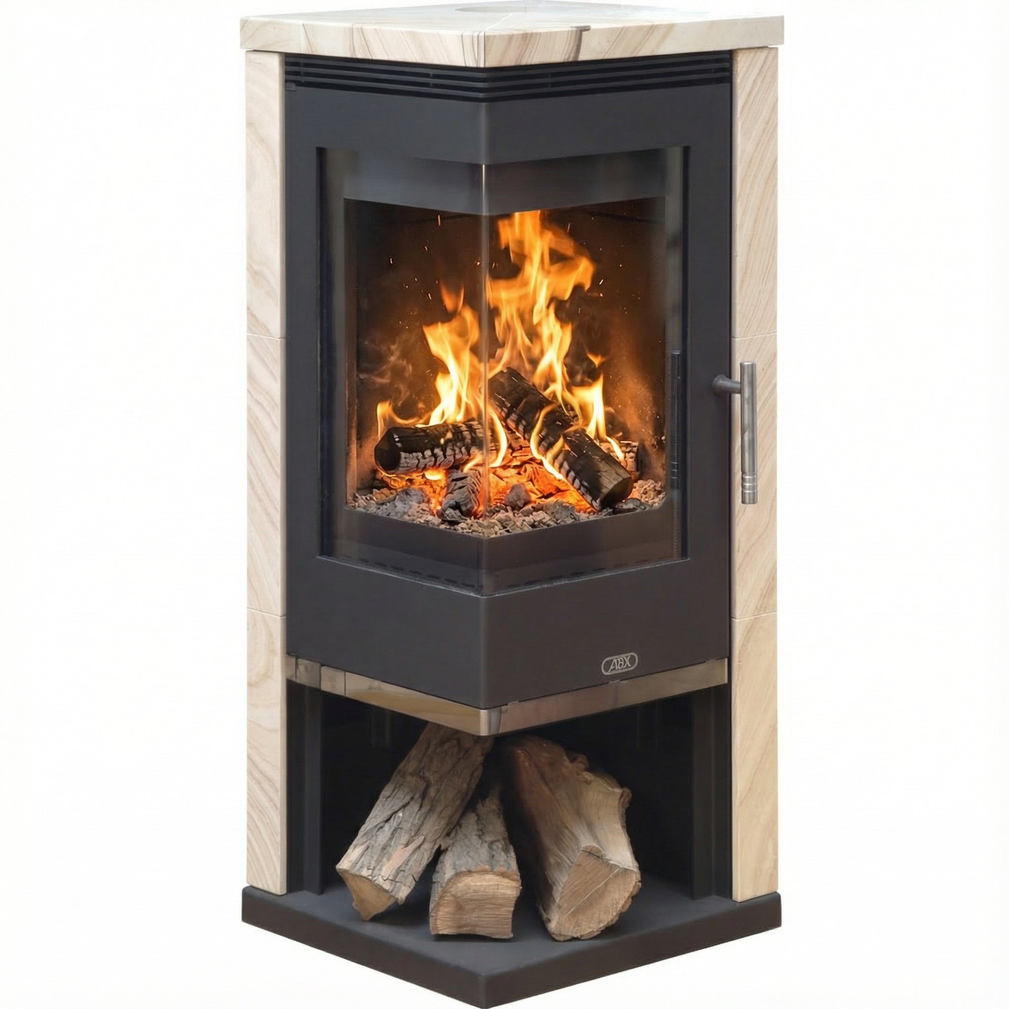 ABX Admirál i sandsten är en elegant liten hörnkamin som kombinerar modern design med naturmaterial och effektiv värme. Den stora hörnformade glasluckan ger en fantastisk insyn till elden från flera vinklar och skapar en naturlig samlingspunkt i rummet.