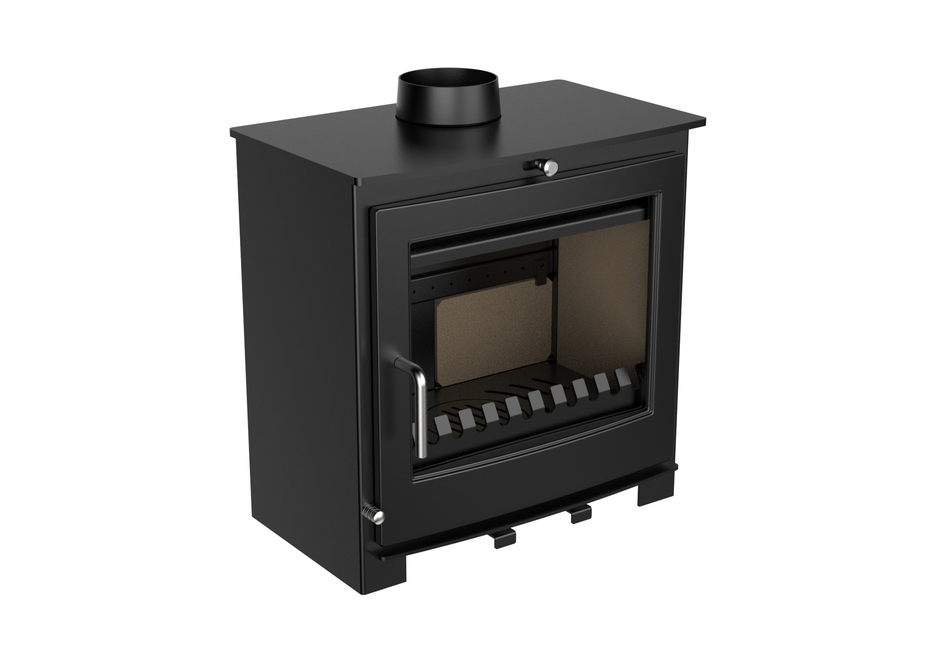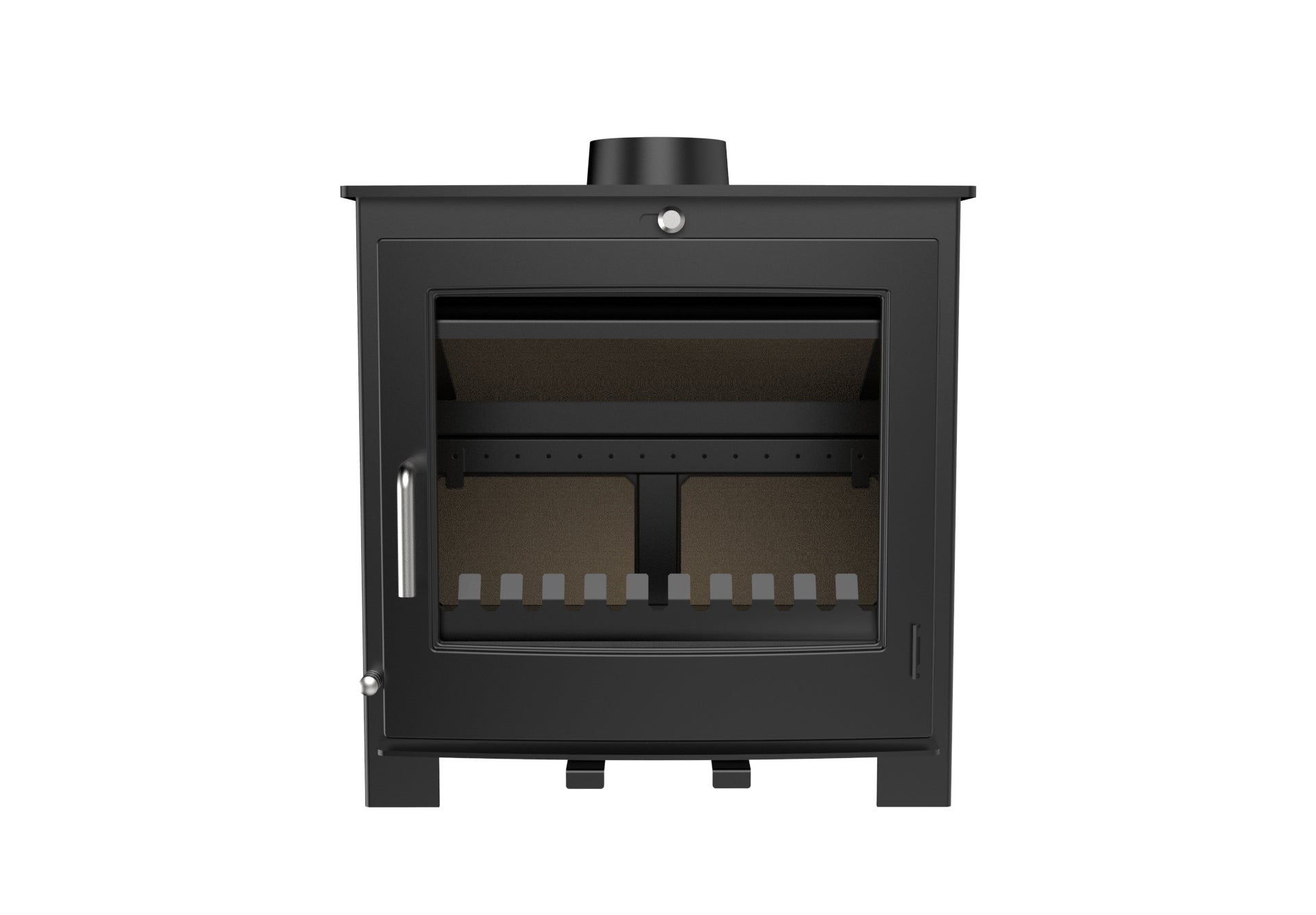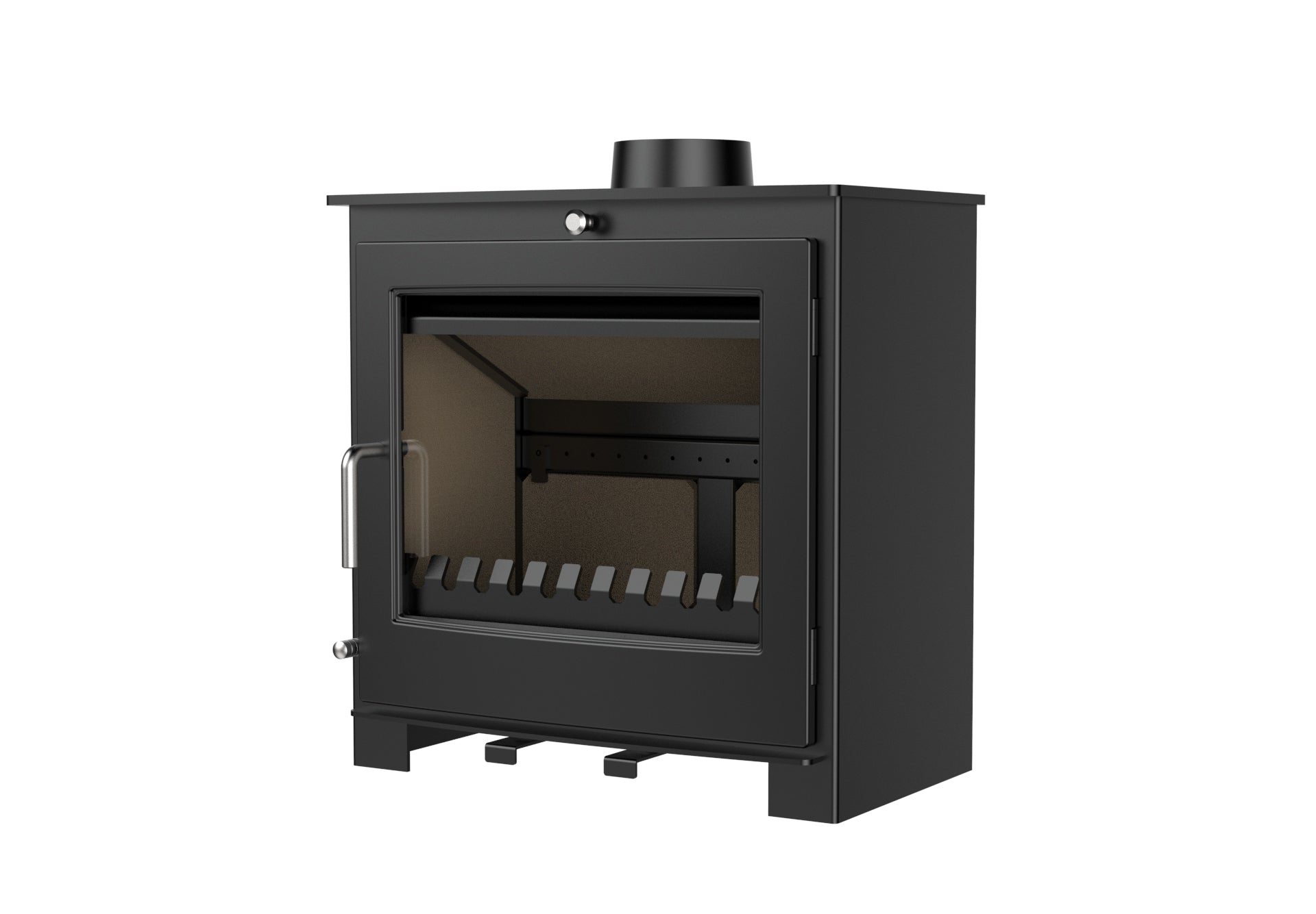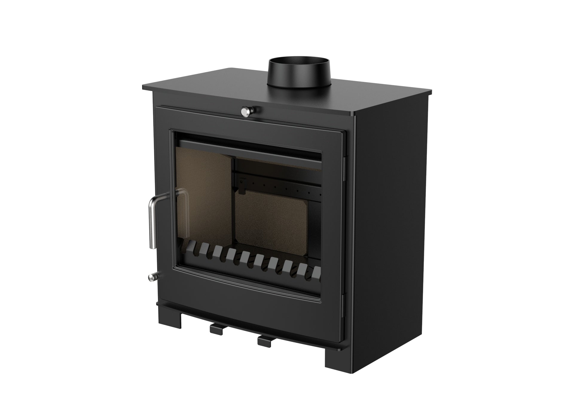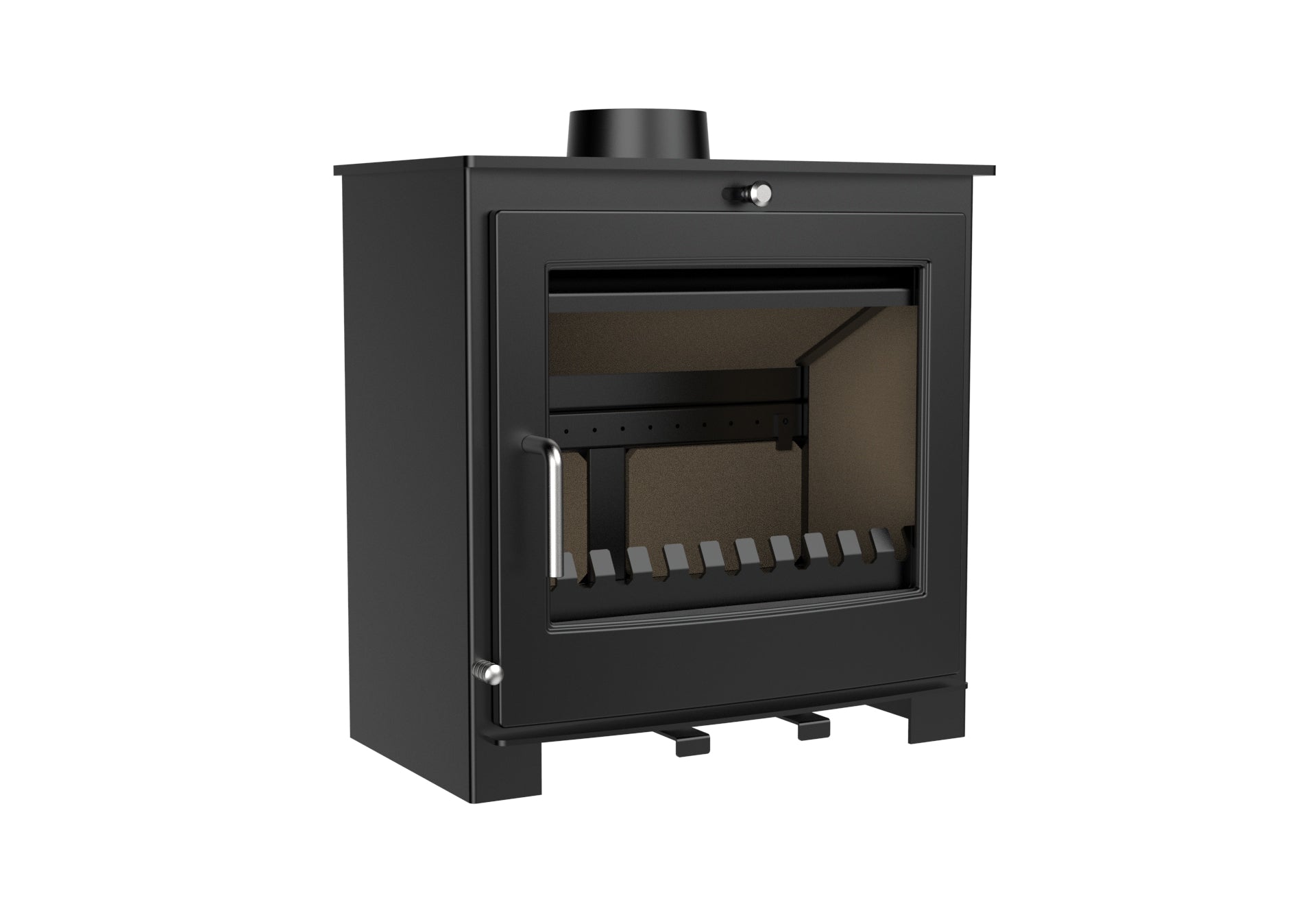Ett rent glassystem håller glaset fritt från sot, vilket minskar behovet av rengöring. Kaminen är också utrustad med en rymlig asklåda. Du har möjlighet att installera skorstenen bakom eller ovanpå kaminen.